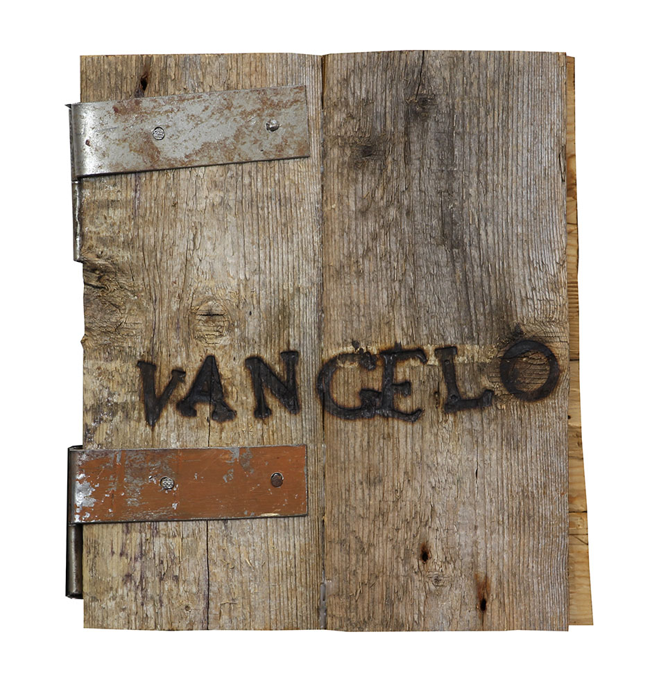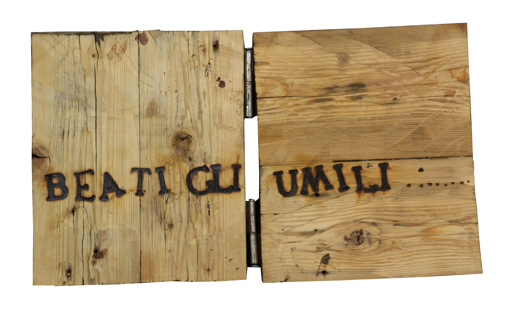 Del Donno Antonio Vangelo "Beati gli Umili", 1976 incisione a fuoco su legno e metallo, cm. 47x27,5 firmata e datata sul cardine al retro, certiticato di autenticità e di archiviazione dell'Archivio Antonio Del Donno su fotografia