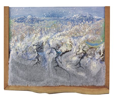 SILVIO MERLINO Napoli 1952 Montagne di carezze, 1990 tecnica mista e applicazioni (polimaterico) su tela e legno cm. 104x122, firma, titolo, anno, timbro ed etichetta della Galleria La Bertesca (GE) al retro, dichiarazione d'autenticità dell'artista su due foto.