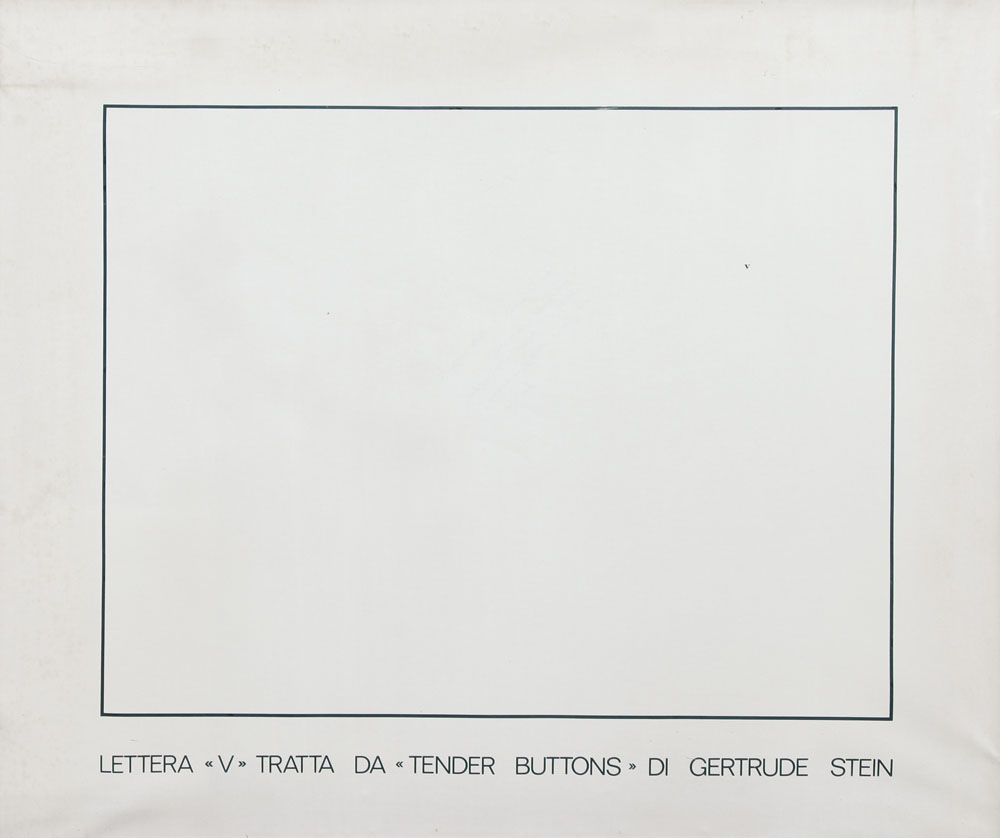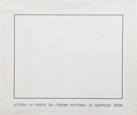 EMILIO ISGRO’ Barcellona Pozzo Di Gotto (Me) 06/10/1937 Lettera "V" tratta da "Tender Buttons" di Gertrude Stein acrilico su tela cm. 76x91, firma e dedica dell'artista ad personam al retro, dichiarazione d'autenticità dell'artista su foto, entro teca in plexiglass (la teca presenta rotture).