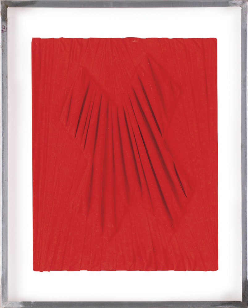 UMBERTO MARIANI Milano 16/11/1936 La forma celata, 2009 acrilico su piombo operato applicato su tavola cm. 42x33 con cornice dell'artista cm. 56,5x45, firma, titolo e anno al retro, dichiarazione d'autenticità dell'artista su foto.