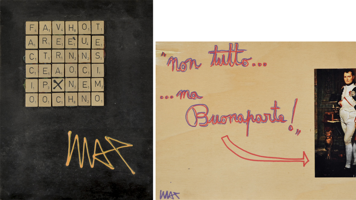 MAX Alessandria 1974 Soggetti vari lotto di 2 tecniche miste e collage su tavola 31x24 - 28x35 entrambe firmate e datate al retro Faccio arte povera perchè non ho un centesimo 2006 Non tutto....ma Buonaparte 2007