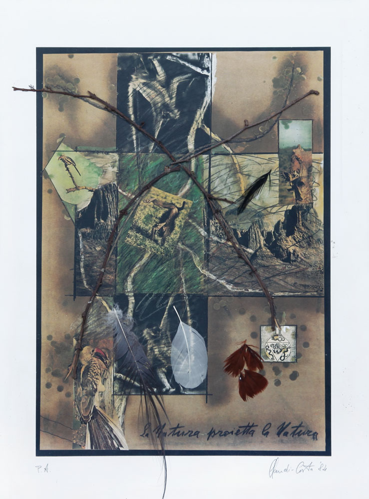 CLAUDIO COSTA Tirana (Albania) 22/06/1942 - Genova 1995 La natura proietta la natura, 1984 serigrafia e applicazioni su carta cm. 70x50, esemplare P.A., firma, titolo e anno in basso a destra.