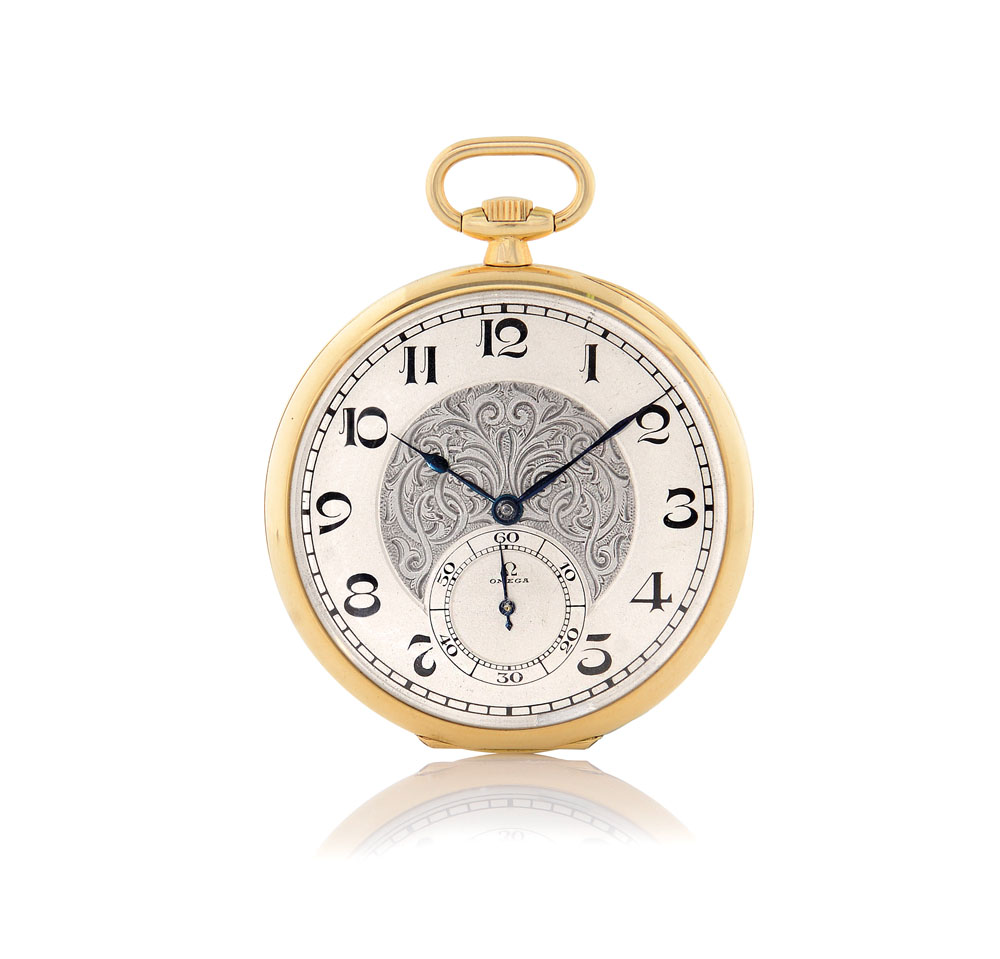 C. smooth 18K yellow gold. D. two-tone silvered engraved in the centre, painted Arabic numerals and subsidiary seconds. M. rhodium finished, anchor escapement, keyless dress. Dial, case and movement signed.