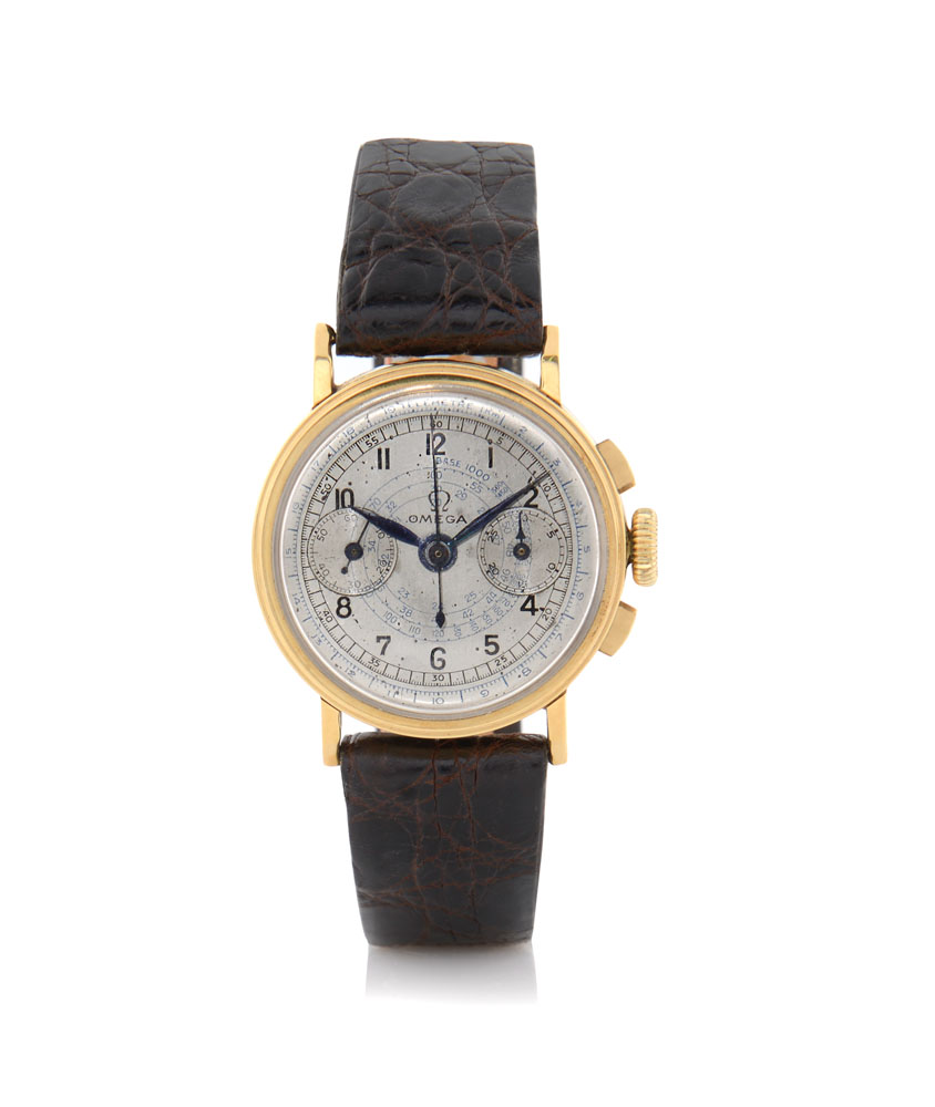C. 18K yellow gold with olive-shaped button and downturned lugs with fixed bars. D. silvered with painted Arabic numerals, 30 minutes register, outer telemetre scale and inner spiral tachymetre scale. M. manual winding. Dial, case and movement signed. Accompanied by Omega buckle.