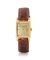 C. rectangular, 18K yellow gold with downturned lugs and inscription engraved on case back, curved crystal. D. two-tone champagne with applied indexes and Arabic numerals, subsidiary seconds. M. manual winding. Dial, case and movement signed.