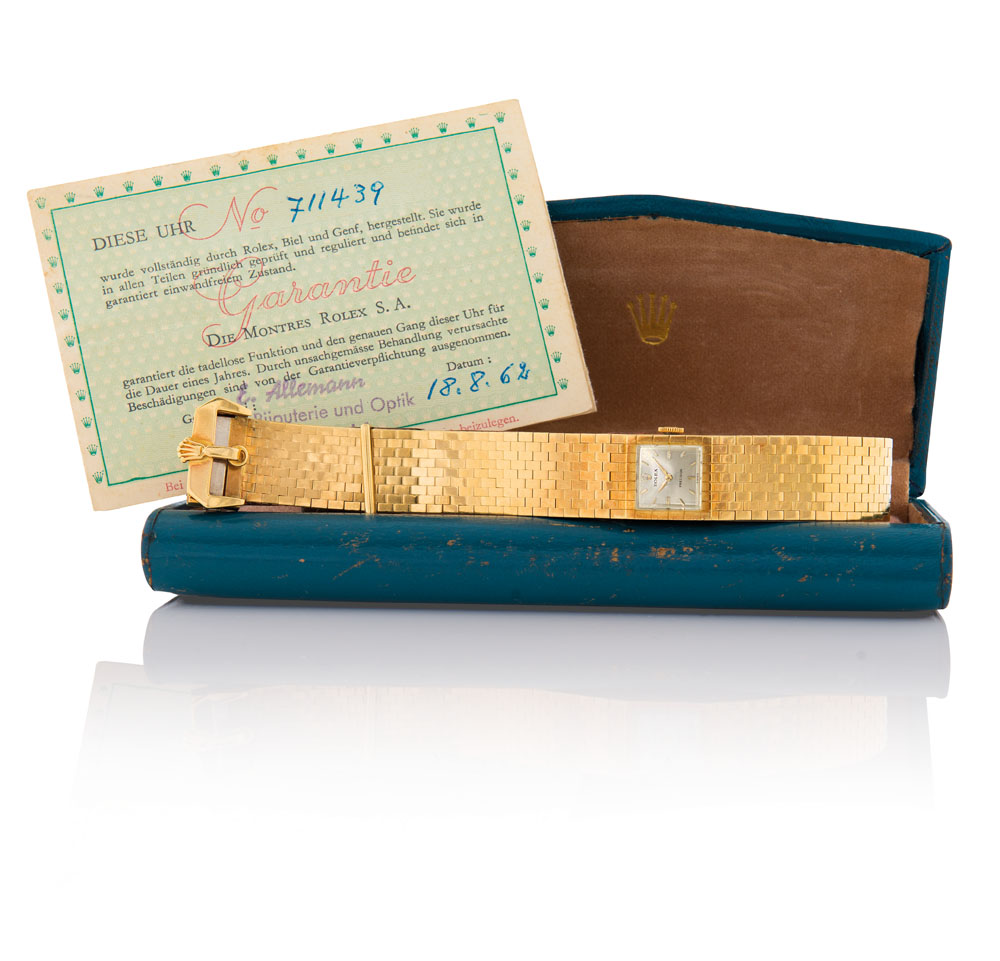 C. 18K yellow gold. D. silvered with applied indexes. M. manual winding. 18K yellow gold belt bracelet. Dial, case, movement and bracelet signed. Accompanied by Rolex box and certificate dated 08/1962.