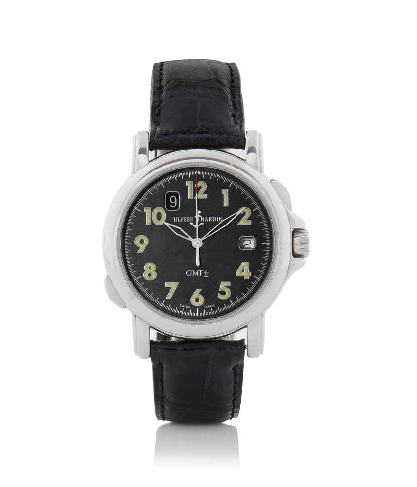 C. stainless steel, case back secured by screws, time set button at 2 and 8. D. black with luminous Arabic numerals and hands, centre seconds, date at 3 e aperture for second time zone with night/day division. M. self-winding. Dial, case and movement signed. Accompanied by Ulysse Nardin box.