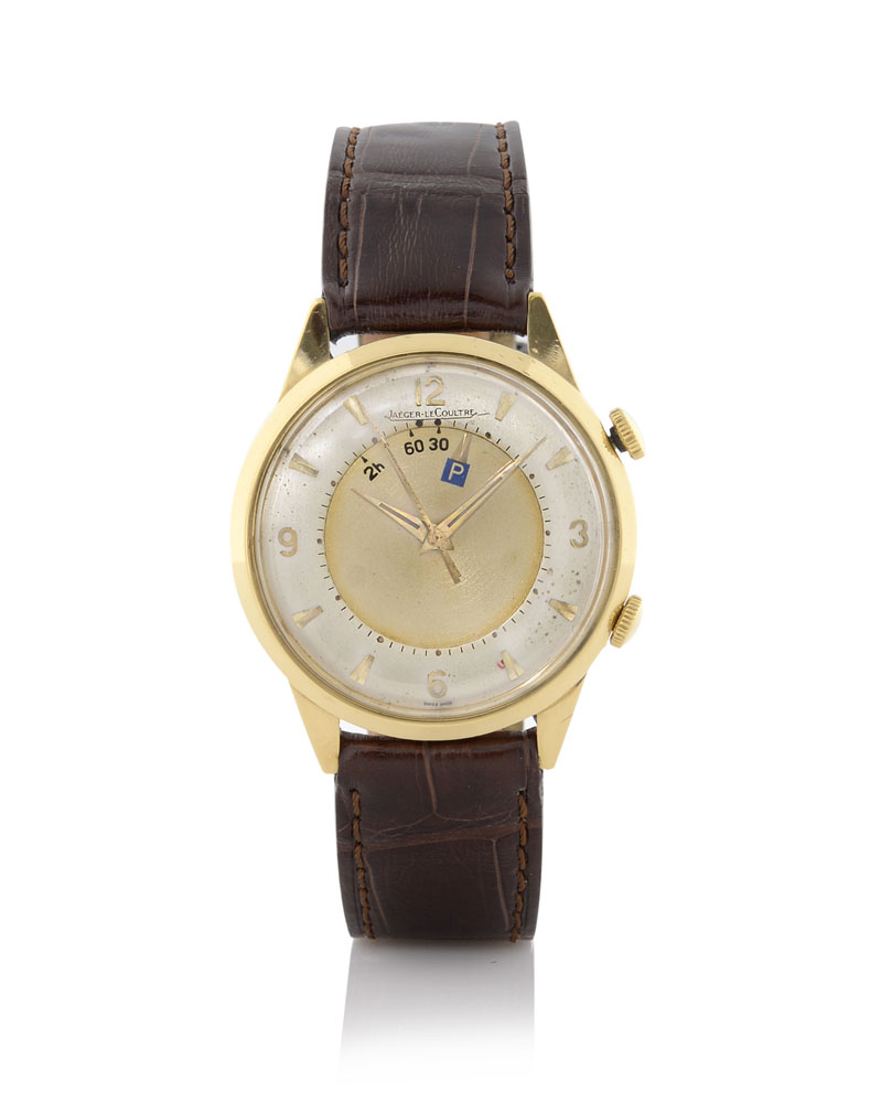 C. 18K yellow gold with two crowns. D. bicolor silvered and champagne with applied indexes and Arabic numerals, centre seconds and central alarm disc with parking indication. M. manual winding. Dial, case and movement signed. Accompanied by Jaeger Le Coultre modern buckle.