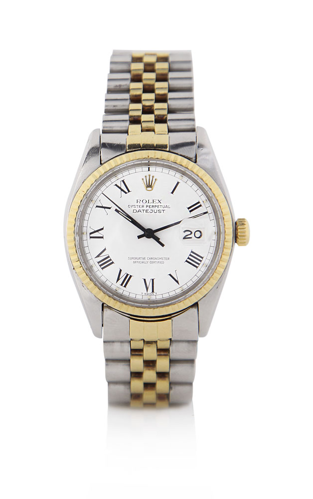C. stainless steel and 18K yellow gold with screwed case back and crown, reeded bezel. D. white with painted Roman numerals, centre seconds and date at 3. M. self-winding. Stainless steel and 18K yellow gold Jubilè bracelet. Dial, case, movement and bracelet signed.