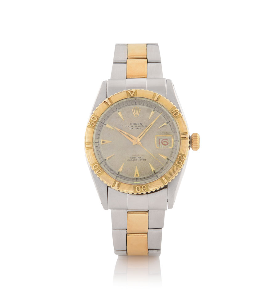 C. stainless steel and 18K yellow gold with screwed case back and crown, graduated and revolving bezel. D. silvered with applied indexes, centre seconds and date at 3. M. self-winding. Stainless steel and 18K yellow gold Oyster bracelet. Dial, case, movement and bracelet signed.