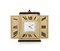 C. a parallelepipedo in ottone dorato con incisione a raggiera, base e top in onice, due antine frontali con pomolo in onice celano il quadrante, argentato con indici smaltati e lancetta per la sveglia al centro. All'interno delle ante grandi numeri romani smaltati. M. al quarzo.