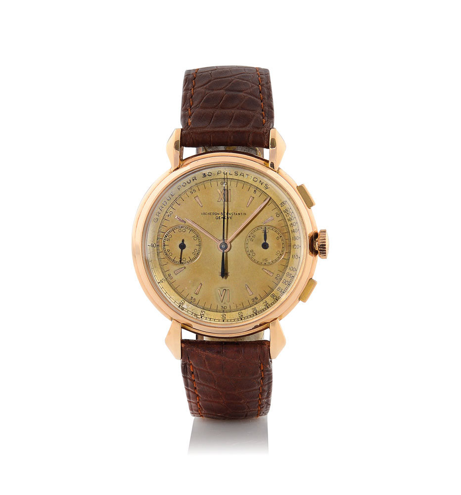 C. 18K pink gold with teardrops lugs and rectangular buttons. D. two-tone silvered with applied indexes and Roman numerals, 30 minutes register, outer pulsometre scale. M. manual winding. Dial, case and movement signed. Accompanied by Vacheron Constantin strap.