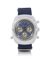 C. tonneau-shaped, stainless steel with screwed case back and three round buttons. D. bicolor blue and silvered with applied indexes, luminous hands, 30 minute and 5 hour registers, outer tachymetre scale. M. manual winding. Dial and case signed.
