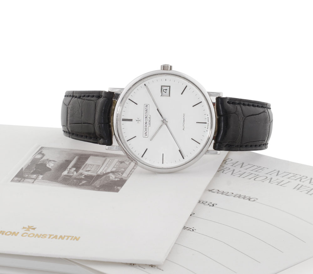 C. 18K white gold with sapphire crystal. D. white with applied indexes, centre seconds and date at 3. M. self-winding. Dial, case and movement signed. Accompanied by Vacheron Constantin strap, 18K white gold buckle, box and certificate dated 03/1999.