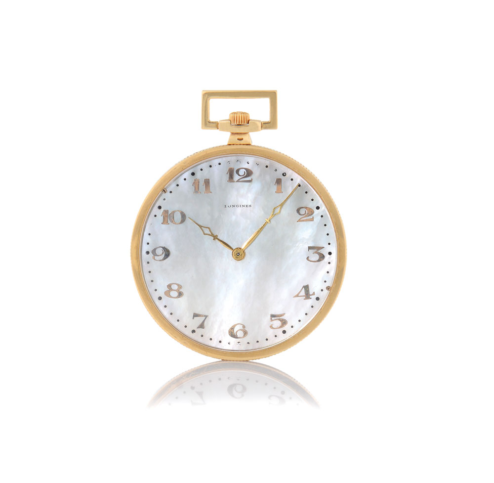 C. 18K pink gold with coin-edged band. D. mother-of-pearl with applied Arabic numerals. M. anchor escapement, keyless dress. Dial and movement signed. Accompanied by Danish seller box.