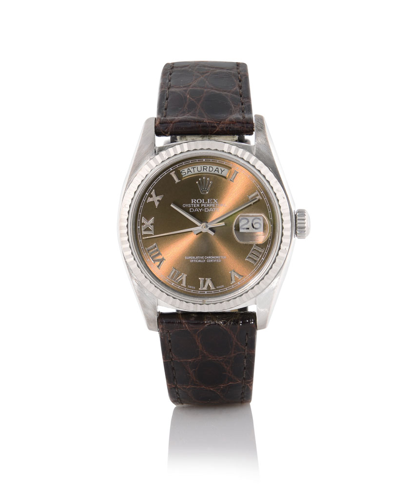 C. 18K white gold with screwed case back and crown, reeded bezel and sapphire crystal. D. dark copper with applied Roman numerals, aperture for day at 12 and date at 3. M. self-winding. Dial, case and movement signed. Accompanied by Rolex strap and buckle.
