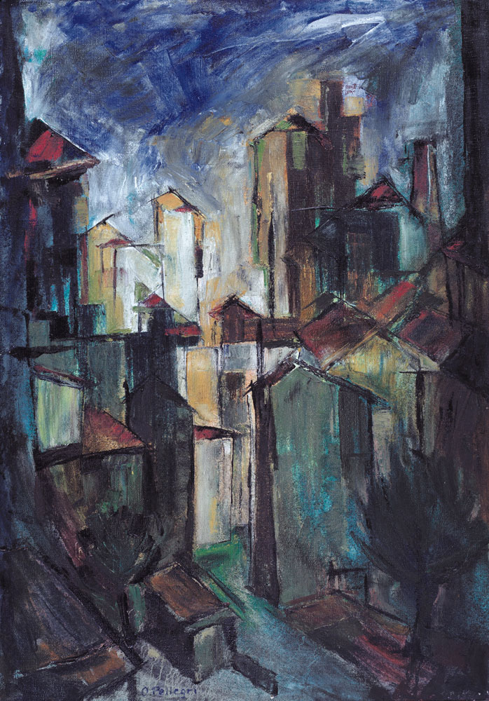PELLEGRI ORESTE Città, 1960 olio su tela cm. 100x70, firma in basso a sinistra, firma e anno al retro.