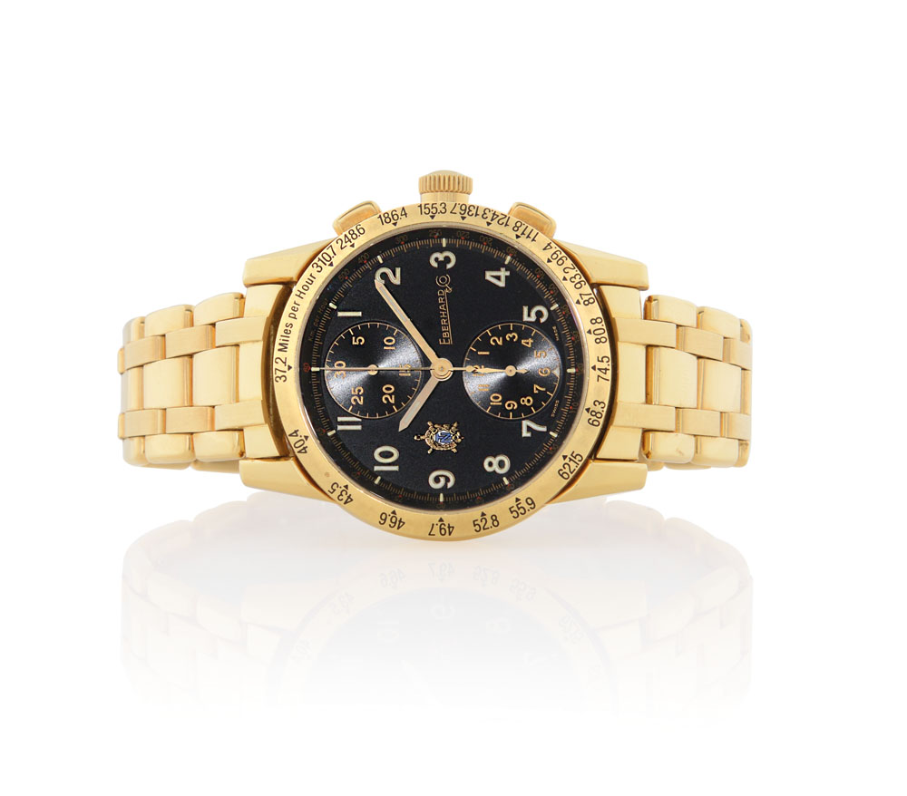 C. solid, 18K yellow gold with rectangular buttons, case back secured by screws with Tazio Nuvolari's signature, bezel with miles scale and sapphire crystal. D. black with luminous Arabic numerals and hands, 30 minute and 12 hour registers. M. self-winding. 18K yellow gold solid bracelet. Dial, case, movement and bracelet signed. Accompanied by Eberhard box and blank certificate.