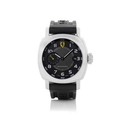 C. cushion-shaped, stainless steel with screwed case back and crown, sapphire crystal. D. bicolor black and grey with luminous Arabic numerals and hands, seconds at 9 and date at 3. M. self-winding. Dial, case and movement signed. Accompanied by Ferrari rubber strap and stainless steel deployant clasp.