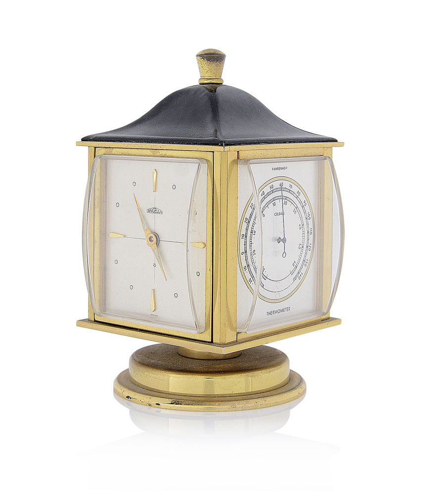 C. a cubo in ottone dorato girevole su base circolare, top nero con pomolo dorato. Q. argentato con indici applicati, indici e lancette luminescenti, lancetta per la sveglia al centro, quadranti supplementari argentati con igrometro, barometro e termometro. M. a carica manuale (8 giorni).
