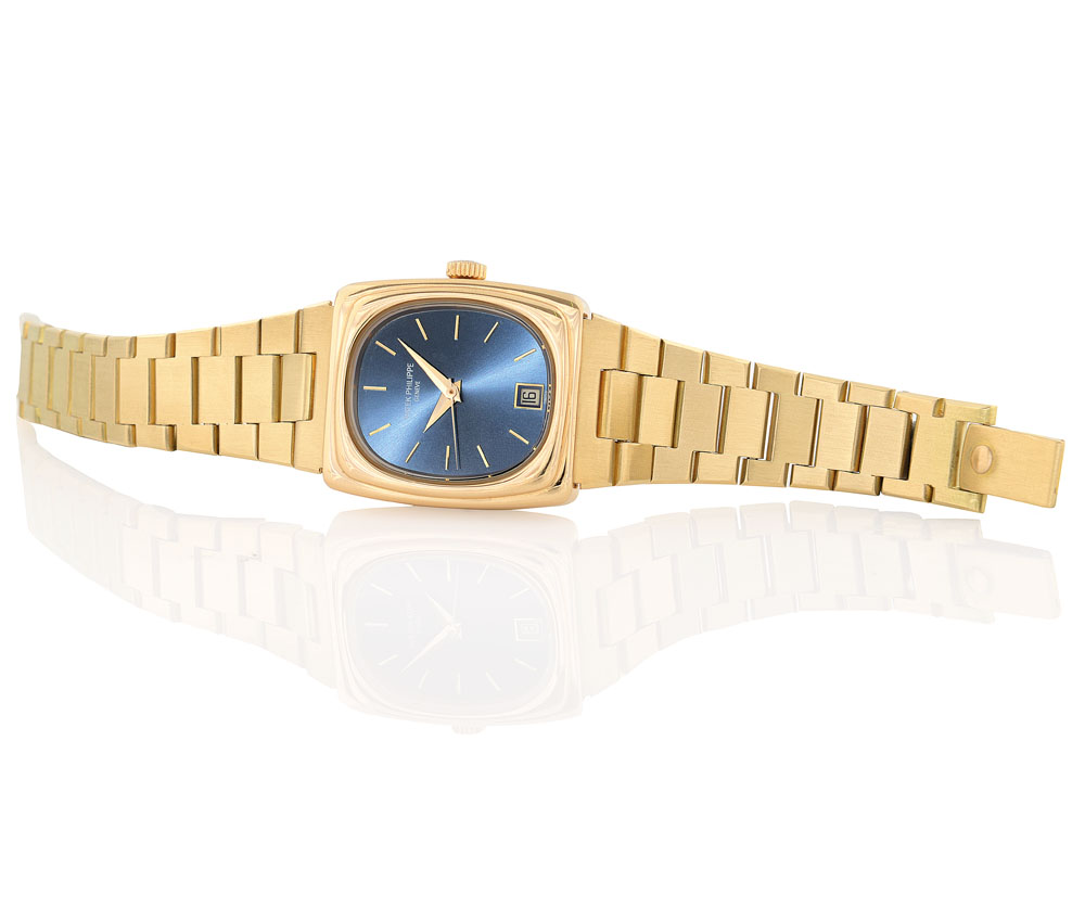 C. rectangular, solid, 18K yellow gold with sapphire crystal. D. blue gold with applied indexes, centre seconds and date at 6. M. cal. B22 quartz. 18K yellow gold solid bracelet. Dial, case and movement signed. Accompanied by Extract from the Archives.