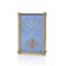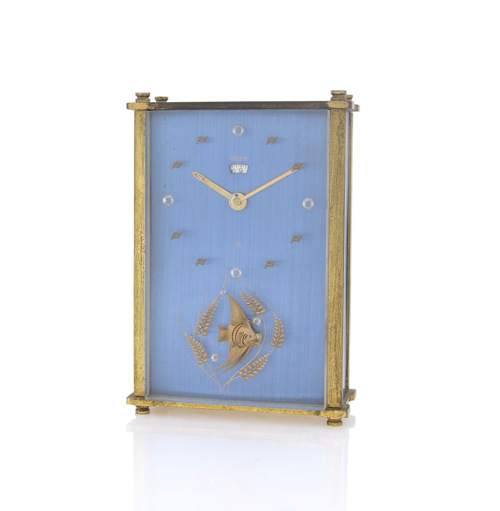 C. a parallelepipedo in ottone dorato. Q. blu con pesce dorato a rilievo, indici ad onde, finestrella per la sveglia al 12. M. a carica manuale (8 giorni) con sveglia musicale.