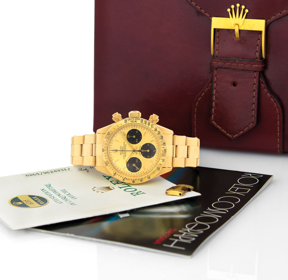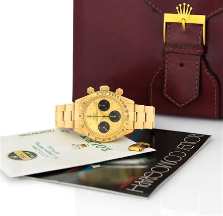 C. n. 9624931 in oro giallo 18 kt con fondello, corona e pulsanti a vite, lunetta con scala tachimetrica (fondello ref. 6263). Q. bicolore champagne e nero con indici applicati, contatore a 30 minuti e 12 ore. M. n. 13153 cal. 727 a carica manuale. Bracciale Oyster in oro giallo 18 kt. Quadrante, cassa, movimento e bracciale firmati. Completo di astuccio e certificato originale del 12/1987, venduto da Pisa Milano.