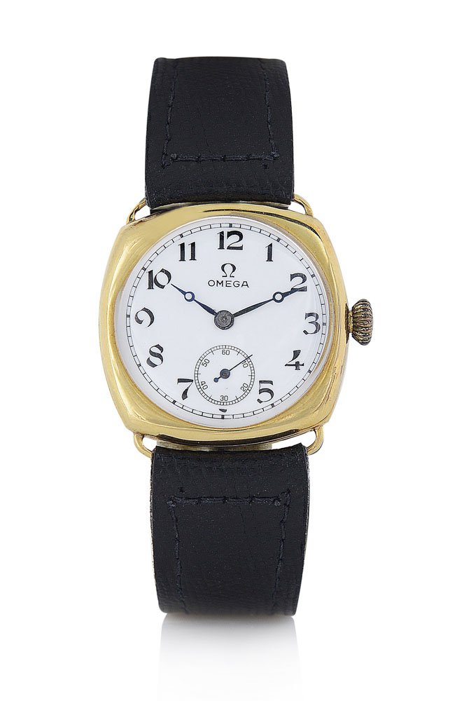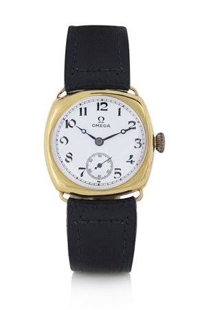 C. 18K yellow gold with wire lugs. D. white enamel with Arabic numerals and subsidiary seconds. M. manual winding. Dial, case and movement signed.