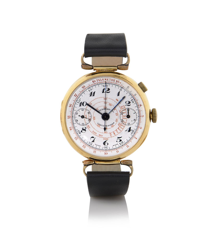 C. 18K yellow gold with hinged case back, olive-shaped button and central wire lugs. D. white enamel whit painted Arabic numerals, 30 minutes register, outer telemetre scale and inner spiral tachymetre scale. M. manual winding. Dial, case and movement signed.