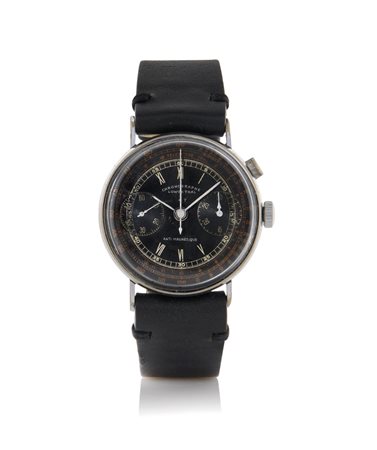 C. n. 38260 in metallo con fondello in acciaio, pulsante tondo al 2 ed anse fisse. Q. nero con numeri romani smaltati, contatore a 30 minuti, scala tachimetrica e telemetrica periferica. M. a carica manuale. Quadrante firmato, cassa numerata.