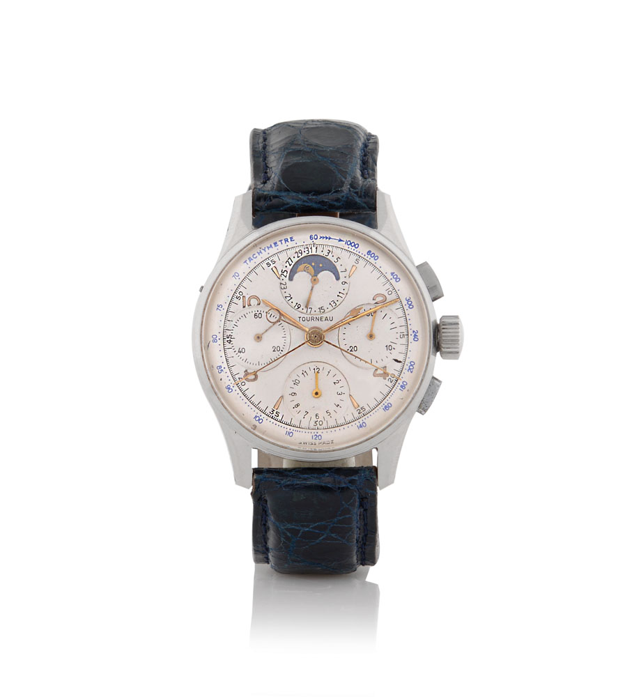 C. stainless steel with rectangular buttons and button through the crown. D. silvered with Arabic numerals and indexes on relief, 30 minute and 12 hour registers, outermost date with corresponding central hand and phases of the moon at 12, outer tachymetre scale. M. Venus base cal. 175, manual winding. Dial, case and movement signed.