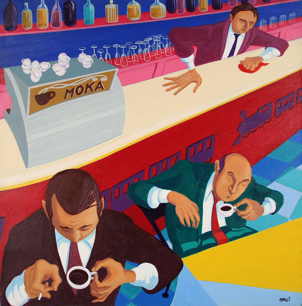 STEFANO GALLI Falconara Marittima (An) 20/11/1950 Bar Stazione 2, 2001 acrilici su tela cm. 60x60, firma in basso a destra, titolo, firma e anno al retro, dichiarazione d'autentica dell'artista e archivio Meeting Art (Vc) su foto.