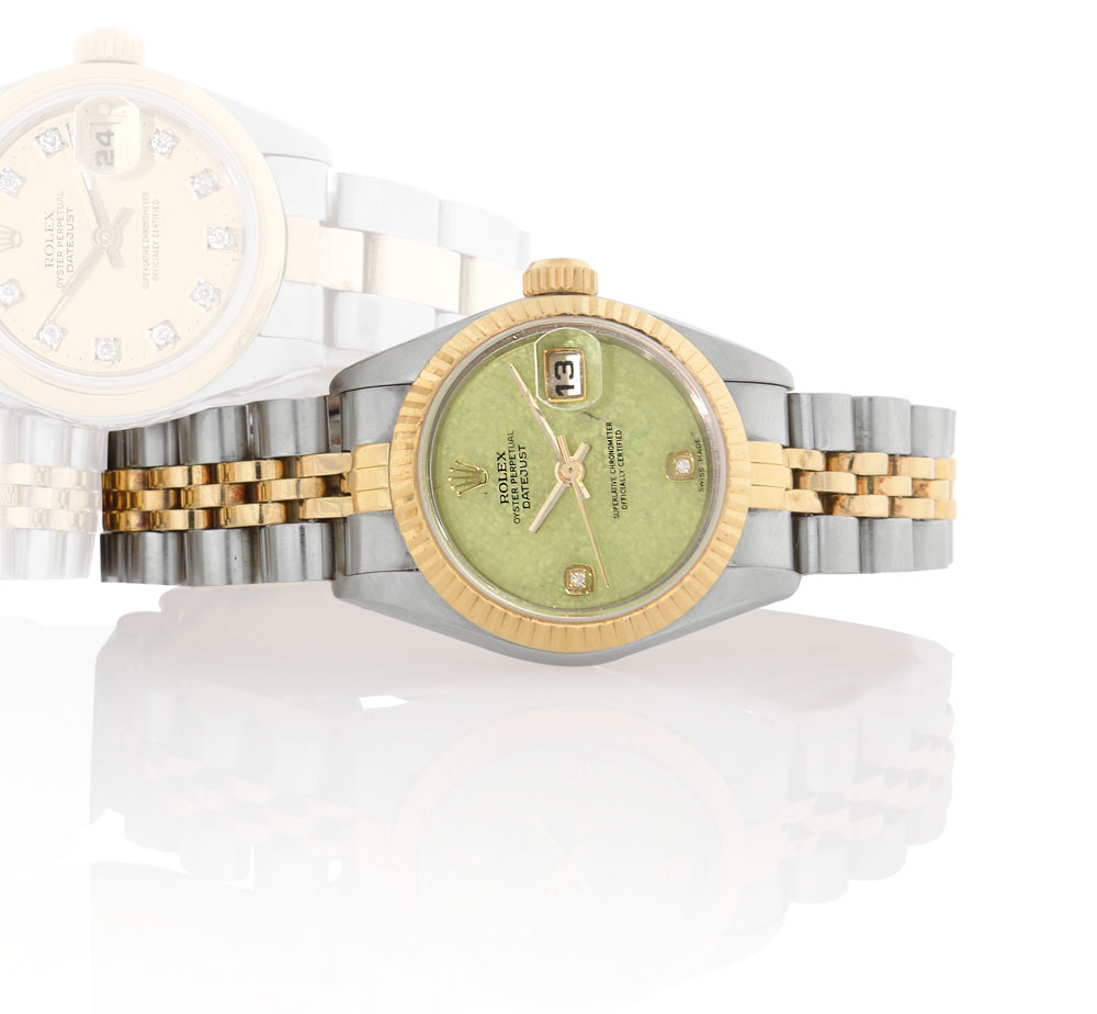 C. stainless steel and 18K yellow gold with screwed case back and crown, reeded bezel and sapphire crystal. D. green stone with applied diamond and yellow gold Arabic numerals, centre seconds and date at 3. M. self-winding. Stainless steel and 18K yellow gold Jubilè bracelet. Dial, case, movement and bracelet signed. Accompanied by Rolex box and certificate dated 06/1999.