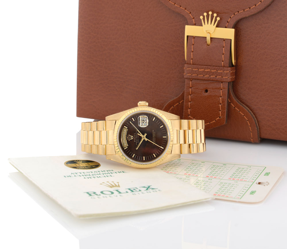 C. 18K yellow gold with screwed case back and crown, reeded bezel and sapphire crystal. D. mahogany wood with applied indexes, aperture for day at 12, centre seconds and date at 3. M. self-winding. 18K yellow gold President bracelet. Dial, case, movement and bracelet signed. Accompanied by Rolex box and certificate dated 12/1983.