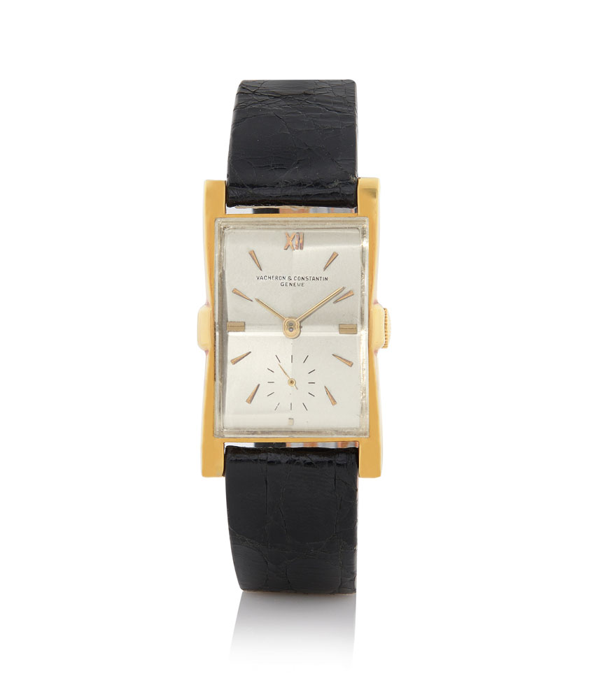 C. rectangular, 18K yellow gold with concave sides and stepped glass. D. silvered with applied indexes and Roman numeral, subsidiary seconds. M. rectangular, manual winding. Dial, case and movement signed. Accompanied by Vacheron Constantin strap and 18K yellow buckle.