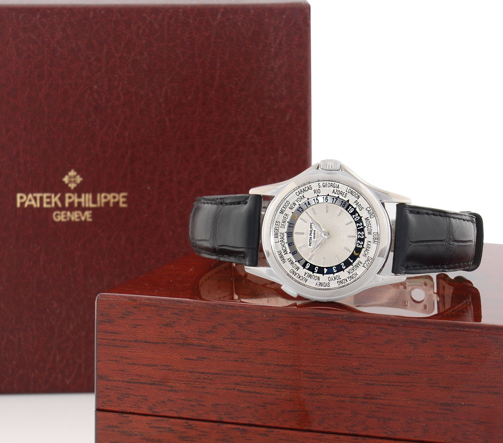 C. 18K white gold with transparent screwed case back, sapphire crystal and push button on the band to activate the settable disc with different time zone at 10. D. silvered with soleil motif in the centre and applied indexes, rotating disc with 24 hours and day/night division, additional rotating disc with main world cities. M. self-winding with gold micro-rotor. Dial, case and movement signed. Accompanied by Patek Philippe strap, 18K white gold deployant clasp, box and certificate.