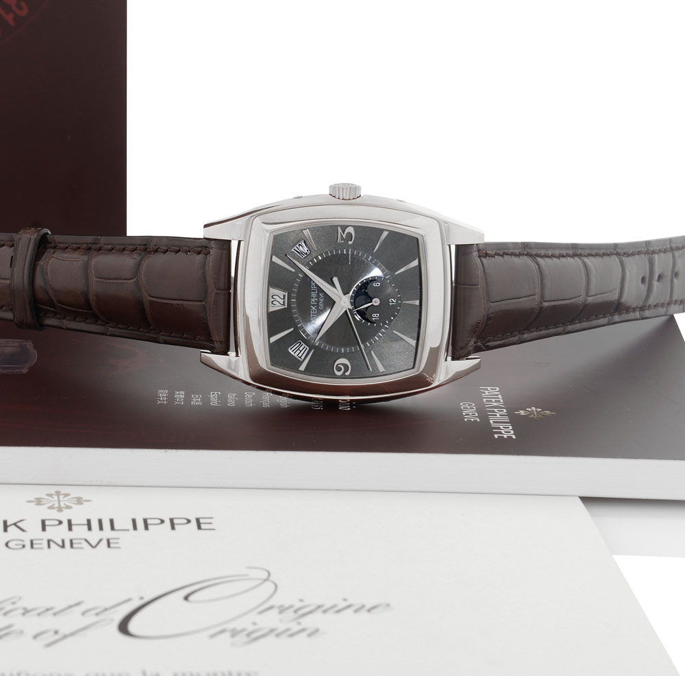 C. tonneau-shaped, 18K white gold with transparent screwed case back, sapphire crystal. D. slate with applied indexes and Arabic numerals, apertures for day, date and month, phases of the moon and 24 hours at 6. M. cal. 324 S self-winding. Dial, case and movement signed. Accompanied by Patek Philippe strap, 18K white gold buckle, box and certificate dated 09/2007.