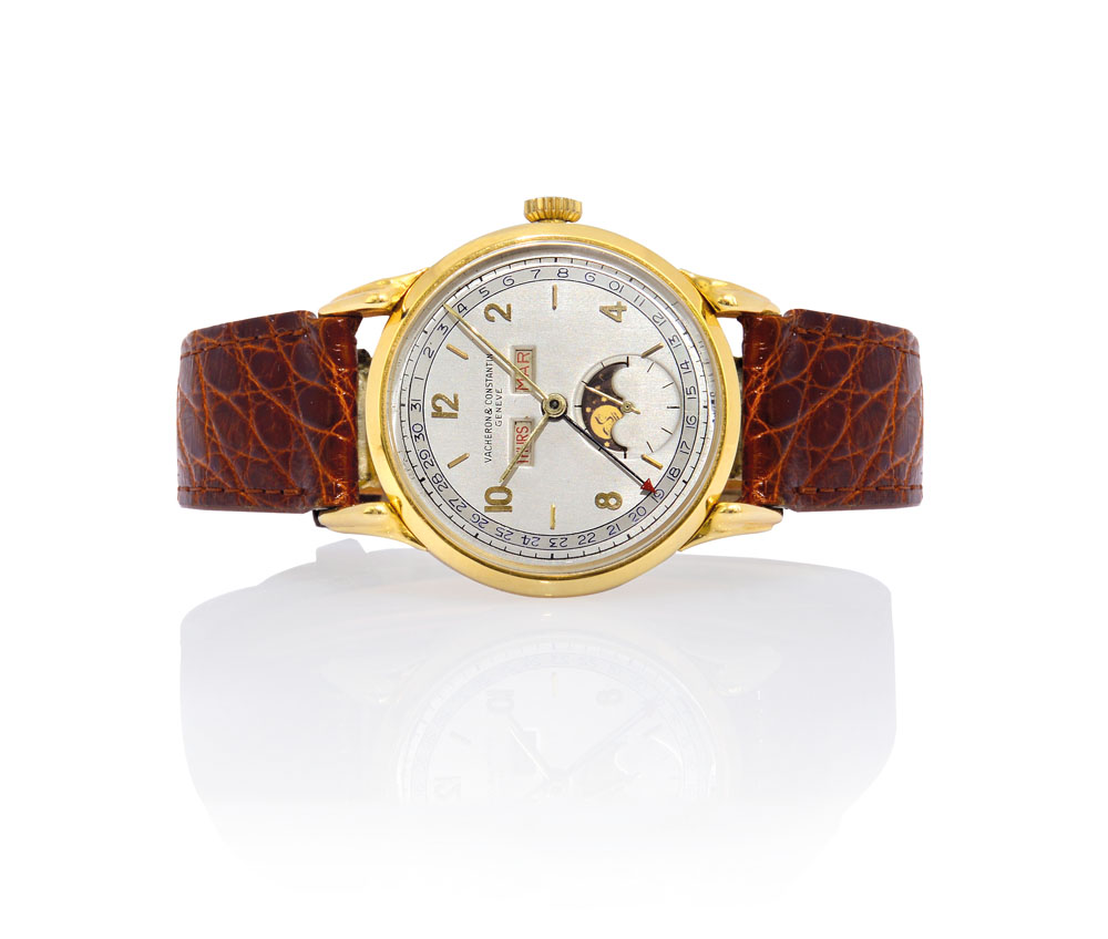 C. 18K yellow gold with spider lugs. D. two tone silvered with applied indexes and Arabic numerals, aperture for day and month at 12, subsidiary seconds and phase of the moon at 6, outermost date with corresponding central hand. M. swan-neck regulator, manual winding. Dial, case and movement signed. Accompanied by Vacheron Constantin 18K yellow gold buckle.