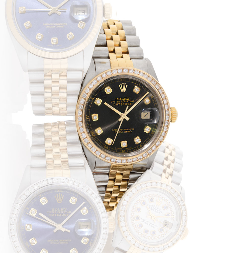C. n. 9005296 in acciaio e oro giallo con fondello e corona a vite, lunetta in brillanti. Q. nero con indici in brillanti, secondi al centro e data al 3. M. a carica automatica. Bracciale Jubilè in acciaio e oro giallo 18 kt. Quadrante, cassa, movimento e bracciale firmati.
