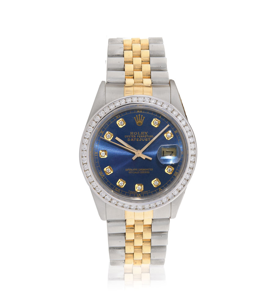 C. stainless steel and 18K yellow gold with screwed case back and crown, diamond bezel. D. blue with diamond indexes, centre seconds and date at 3. M. self-winding. Stainless steel and 18K yellow gold Jubilè bracelet. Dial, case, movement and bracelet signed.