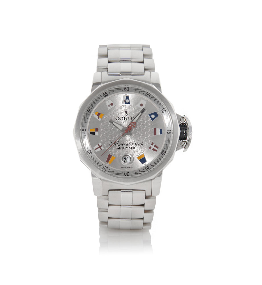 C. stainless steel with case back secured by screws, sapphire crystal. D. silvered, engraved in de centre with polychrome nautical flags hour markers, luminous hands, centre seconds and date at 3. M. self-winding. Stainless steel bracelet with deployant clasp. Dial, case, movement and bracelet signed. Accompanied by Corum box and certificate dated 05/2006.