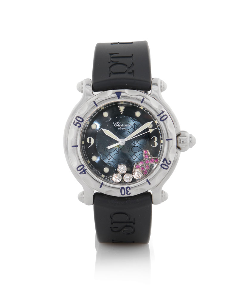 C. stainless steel with case back secured by screws, graduated and revolving bezel, 3 diamonds and one fish with rubies floating between crystals. D. dark blue with luminous indexes, Arabic numerals and hands, centre seconds and date between 4 and 5. M. quartz. Dial, case and movement signed. Accompanied by Chopard rubber strap and stainless steel buckle.