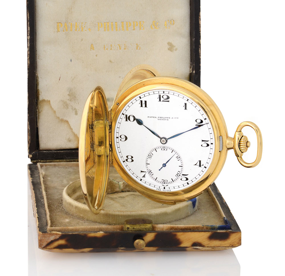 C. hunter case, 18K yellow gold with engraved monogram and year 1928, inscription inside. D. white enamel with painted Arabic numerals and subsidiary seconds. M. rhodium-finished, minute repeating keyless dress. Dial, case and movement signed. Accompanied by Patek Philippe tortoiseshell box and copy of certificate.