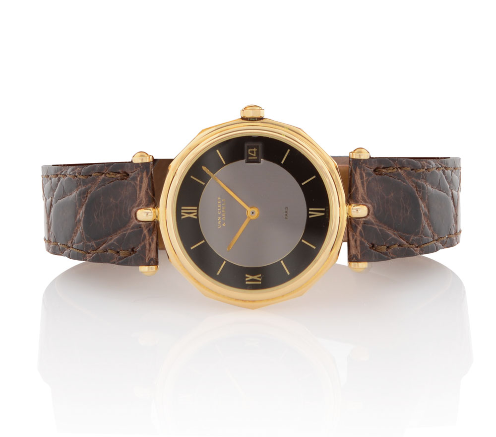 C. 18K yellow gold with central lugs. D. bicolor grey and black with painted Roman numerals and indexes, date at 3. M. manual winding. Dial and movement signed, case numbered. Accompanied by V.C.A. 18K yellow gold deployant clasp.