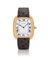 C. 18K yellow gold with case back secured by screws and sapphire crystal. D. white with painted Roman numerals. M. manual winding. Dial, case and movement signed. Accompanied by Cartier 18K yellow gold buckle.