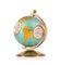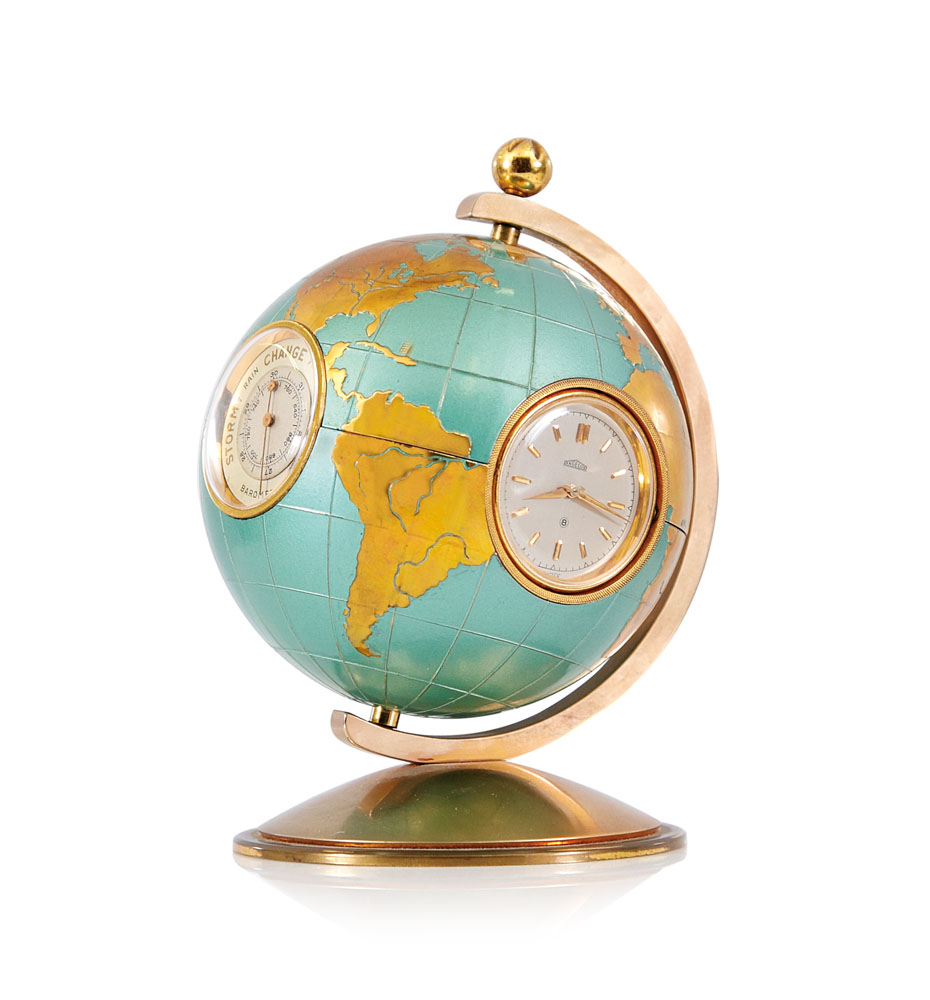C. in ottone dorato rappresentante il globo terrestre con fondo verde e continenti dorati, paralleli e meridiani a rilievo, base circolare. Q. quattro con ore e minuti, termometro, barometro e igrometro. M. a carica manuale (8 giorni).
