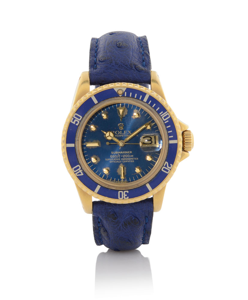 C. 18K yellow gold, screwed case back and crown, blue graduated and revolving bezel. D. blue with applied indexes, luminous hands, centre seconds and date at 3. M. self-winding. Dial, case and movement signed. Accompanied by Rolex 18K yellow gold buckle.