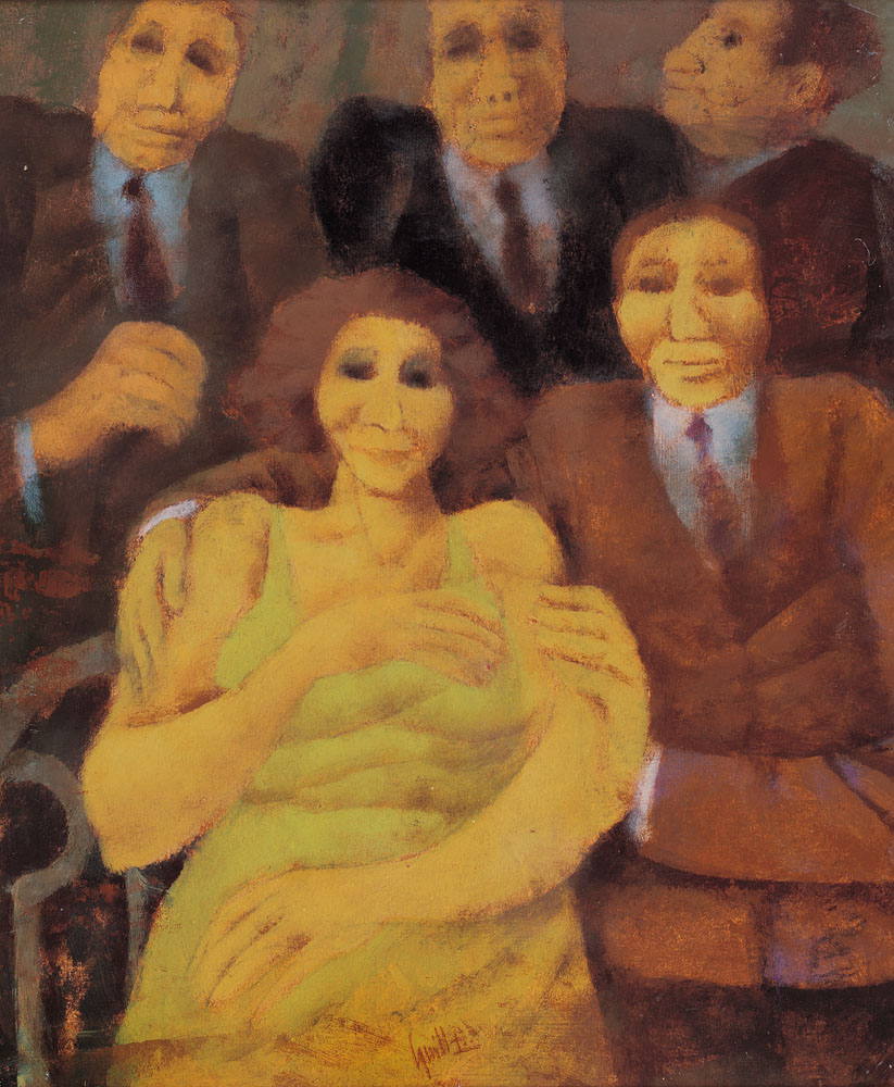 REMO SQUILLANTINI Stia (Ar) 1920 - Firenze 06/08/1996 Figure, anni '95 olio su tavola cm. 60x50, firma in basso al centro e al retro, opera registrata presso l'Archivio Fotografico Generale delle Opere di Remo Squillantini al numero 867/G come da dichiarazione dello Studio R.G.B. su foto.