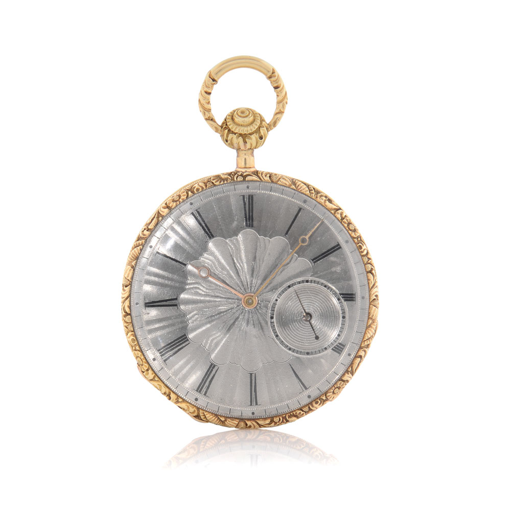 C. openface engraved, 18K yellow gold with decorations on the band. D. soleil, silvered with painted Roman numerals and seconds between 3/4. M. gilt brass, straight-line lever escapement, quarter repeating, key winding. Case signed.