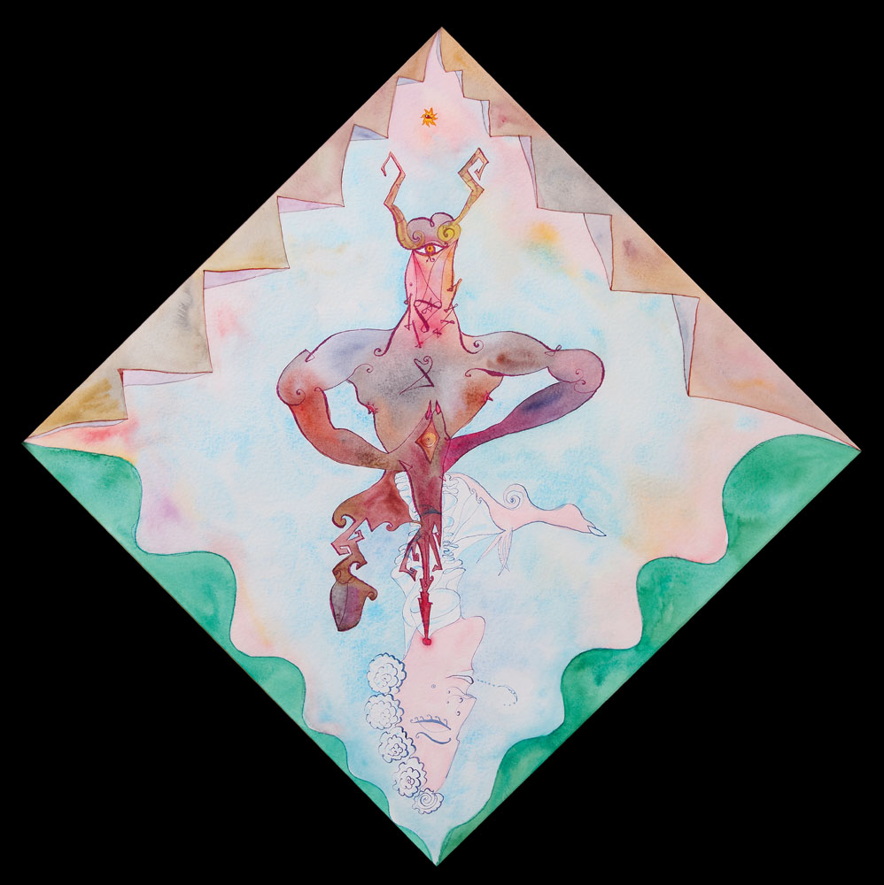 LUIGI ONTANI Vergato (Bo) 1943 Per nati Cristiani et Francescani "Er verginetoro", 1991 acquerello su carta romboidale cm. 85x85 (lato cm. 64), firma, titolo, anno, località (Roma), etichette della Arte Fiera, etichetta e timbro dello Studio d'Arte Campaiola (Roma) al retro, certificato d'autenticità della Orler Galleria d'Arte (Favaro Veneto-VE) allegato.